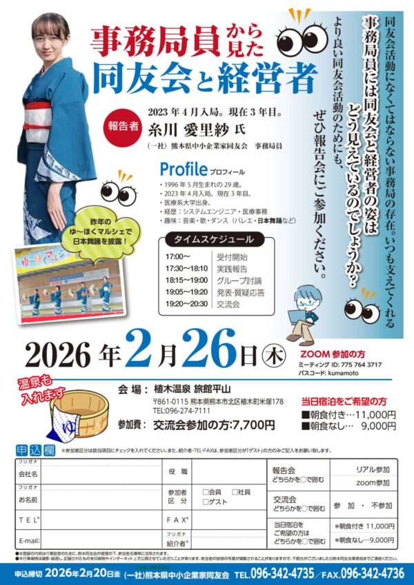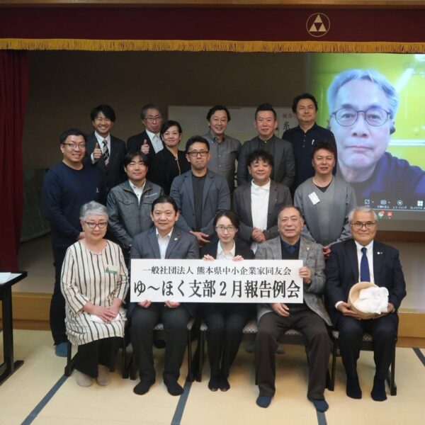 熊本同友会事務局の糸川さんに登場して頂きました。 事務局員となって3年目ですが、今では同友会運動の中で、なくてはならない存在です。 いくつもの支部や委員会を担当していますが、ゆ~ほく支部の担当でもあり、しっかりとサポートしてもらっています。 この日は、ZOOM参加者も含め、約30人の参加で大変賑わいました。 その後の懇親会は、会場である平山旅館で大変贅沢な食事を堪能し、充実した例会でした。