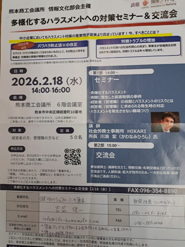 長い付き合いの川浪氏のセミナーがあるということで、久しぶりに商工会議所に出向き、勉強できました。 テーマが「多様化するハラスメントへの対策」と大変興味のある内容でした。